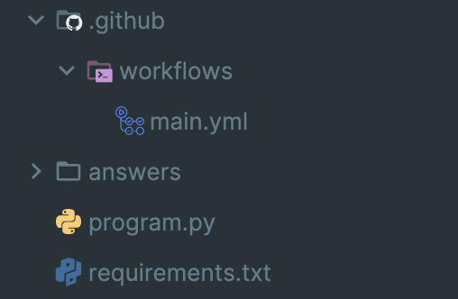 최종 프로젝트 구조는 위와 같다. Github Actions에서 실행할 내용을 담은 main.yml, 정답 소스들을 넣어둘 answers 폴더, 실제 프로그램을 작성할 program.py와 설치해야 할 파이썬 패키지들을 나열한 requirements.txt 파일로 구성되어 있다.