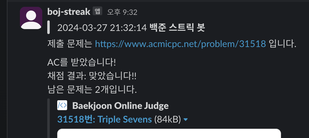 만약 폴더에 남은 문제가 없거나, AC를 받지 못하는 등 스트릭에 영향을 줄 수 있는 문제가 발생할 경우 슬랙 메시지 앞에 \[중요\] 문구를 붙이도록 설정해 두었다.