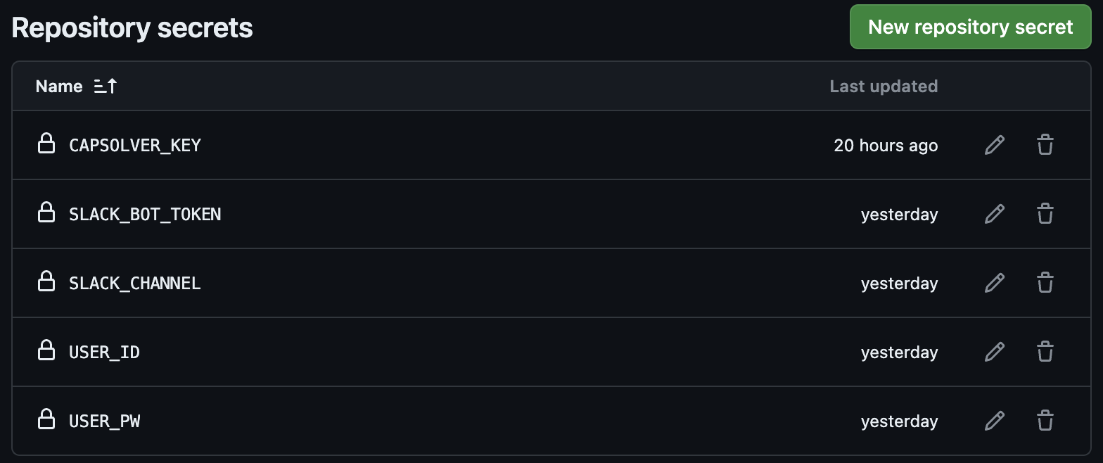 민감한 값들(백준 아이디, 패스워드, 슬랙 토큰 등)은 레포지토리 내의 Secrets에 보관하고 있다가 프로그램 실행 시 전달하도록 하였다.